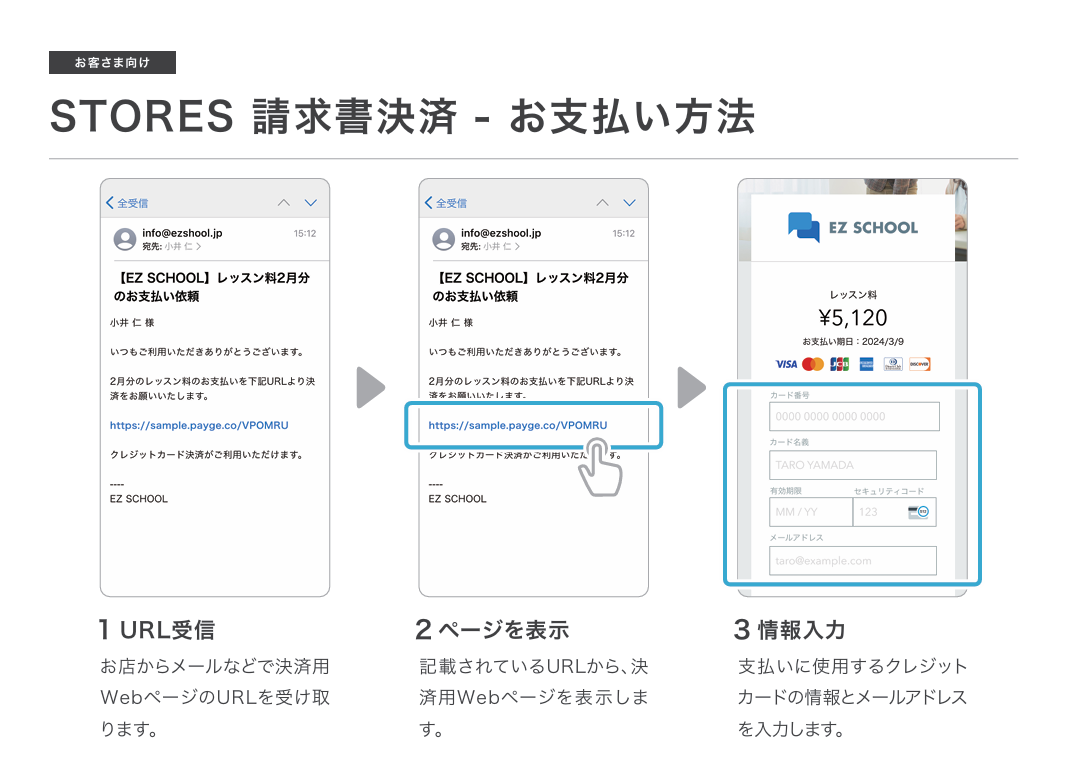 当店では文字入れのオーダーがある特性上、ご注文内容が確定した後にお支払いいただくかたちをとるため、STORES株式会社が提供する「STORES請求書決済サービス」を利用しています。ご注文内容の確認後に、メールでクレジット決済用のリンクをご案内しますので、下記手順に沿ってお支払いのお手続きをお願いいたします。