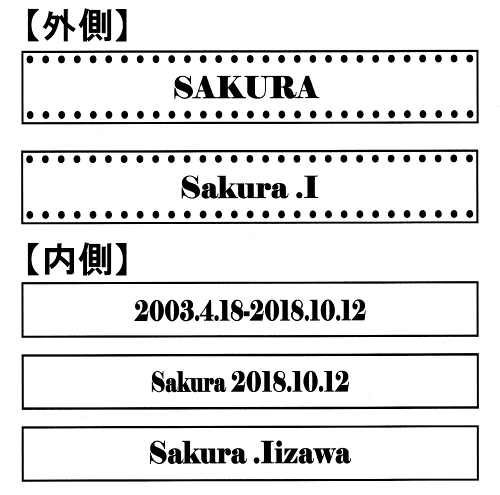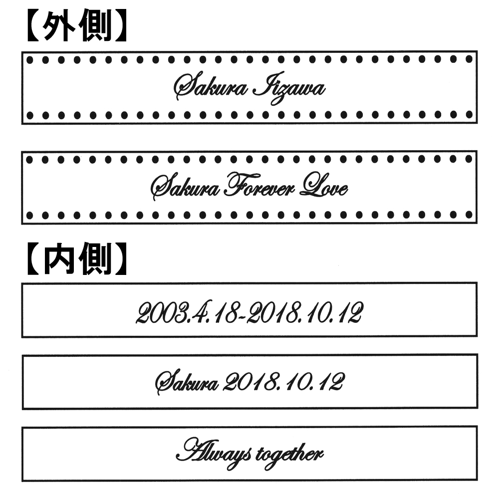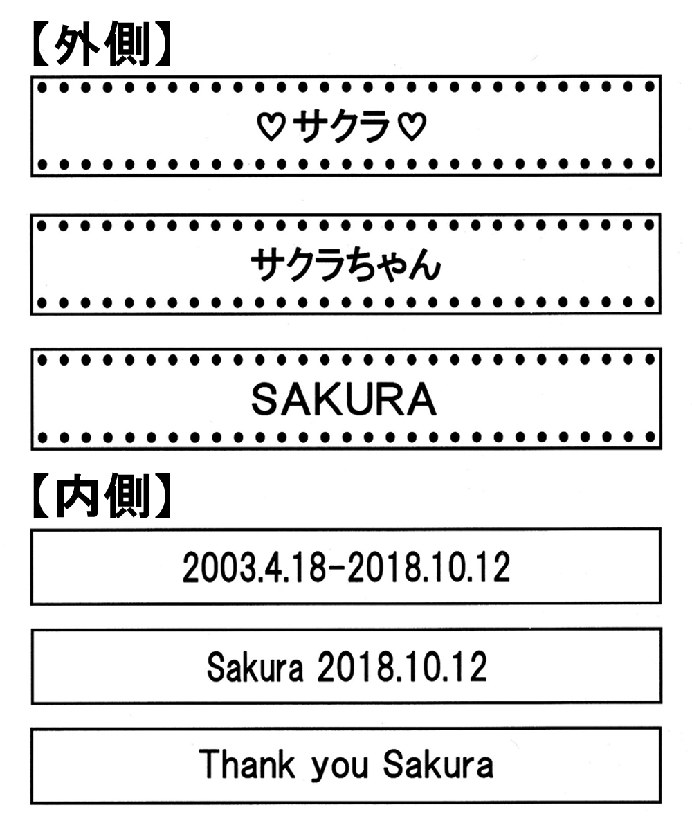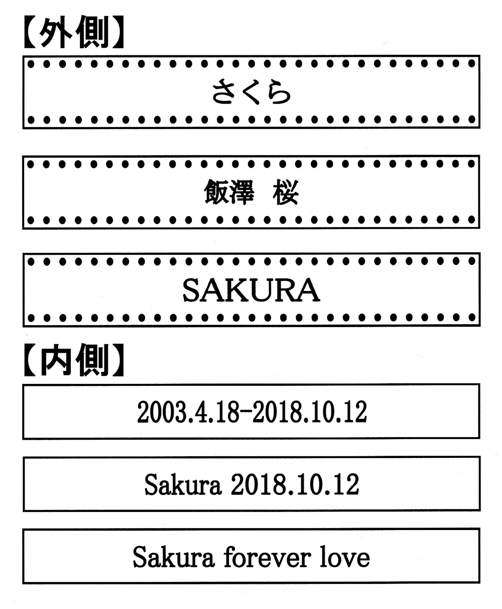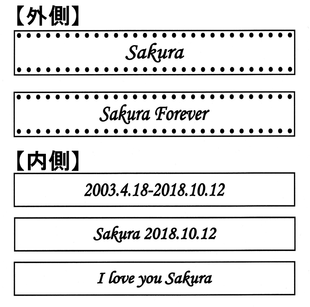 お名前や日付・メッセージなどお好きな文字を刻印できますが、外側にお名前、内側に誕生日〜亡くなられた日を刻んだりメッセージを刻む。というご依頼が多くなっています。