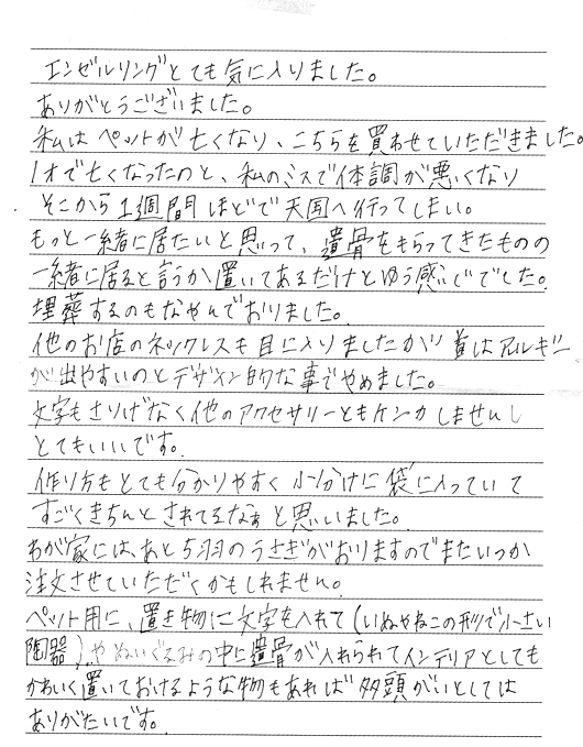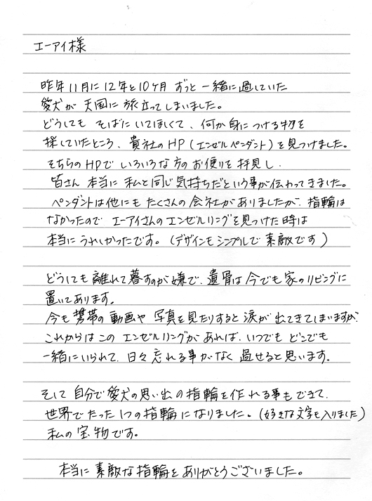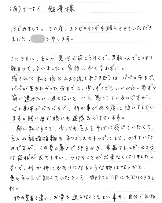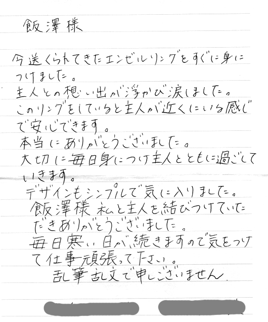 エンゼルリングを通して、ご主人といつも一緒に居るという感覚を感じていただければ、とてもありがたく思います。