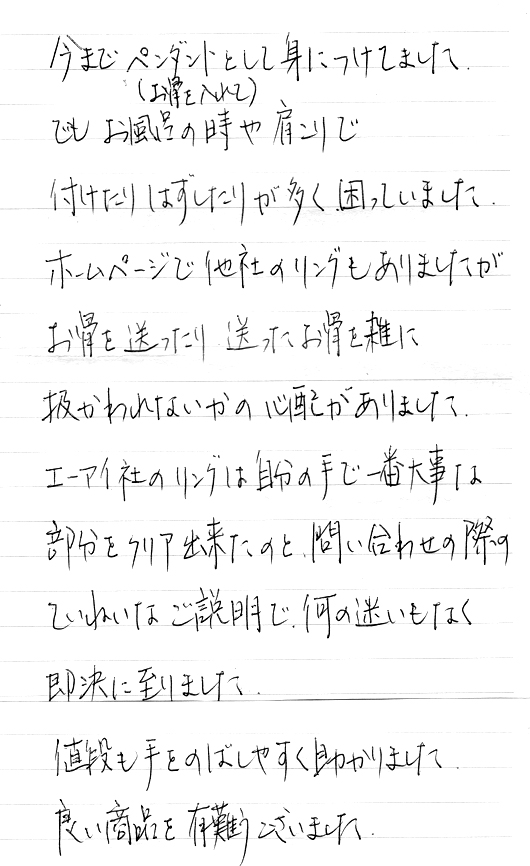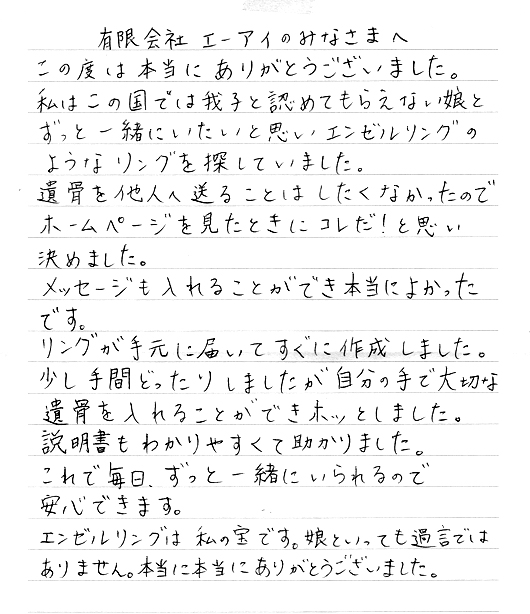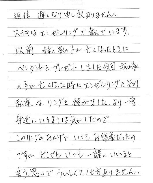 このようなご感想をいただくと、「エンゼルリングを作ってよかった」と実感ができ、大変感謝しております。ありがとうございました。