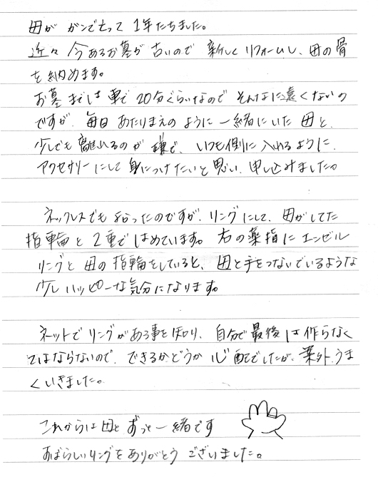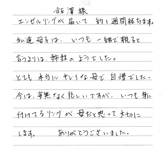 指輪は常に肌に密着していますので、お母様をより身近に感じることができるのだと思います。