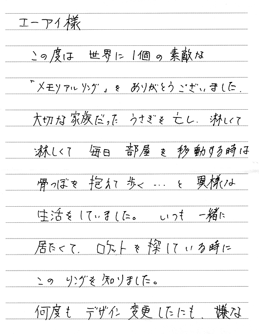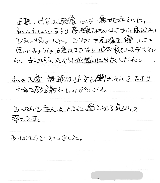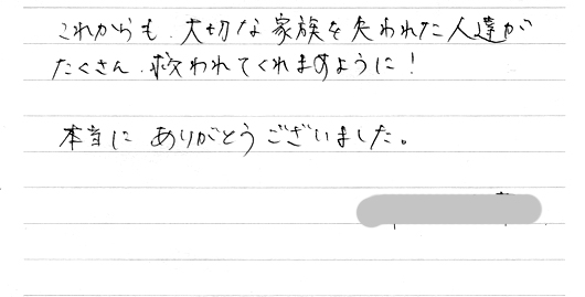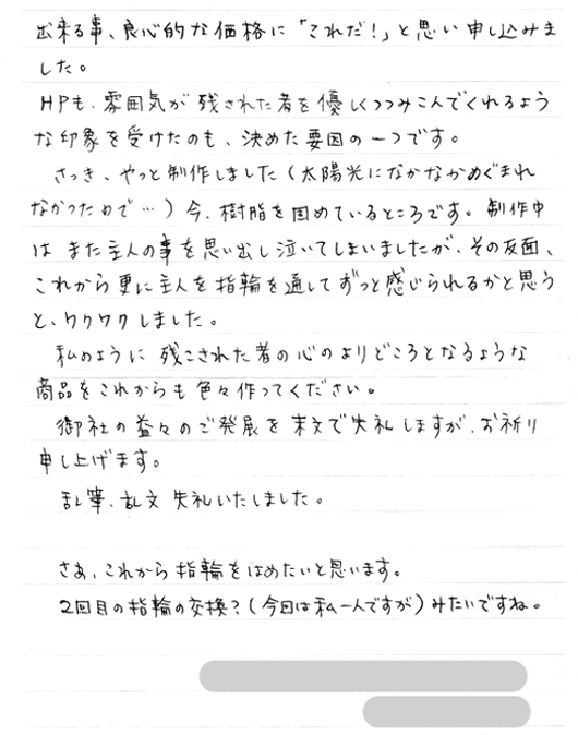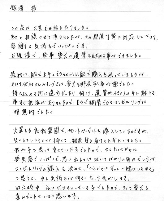 当社でご遺骨を納めさせていただきましたが、ご丁寧な お礼のお電話とこの度のお便りに大変感謝しております。