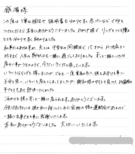 「このリングをしていると主人が近くにいる感じで安心できます。」